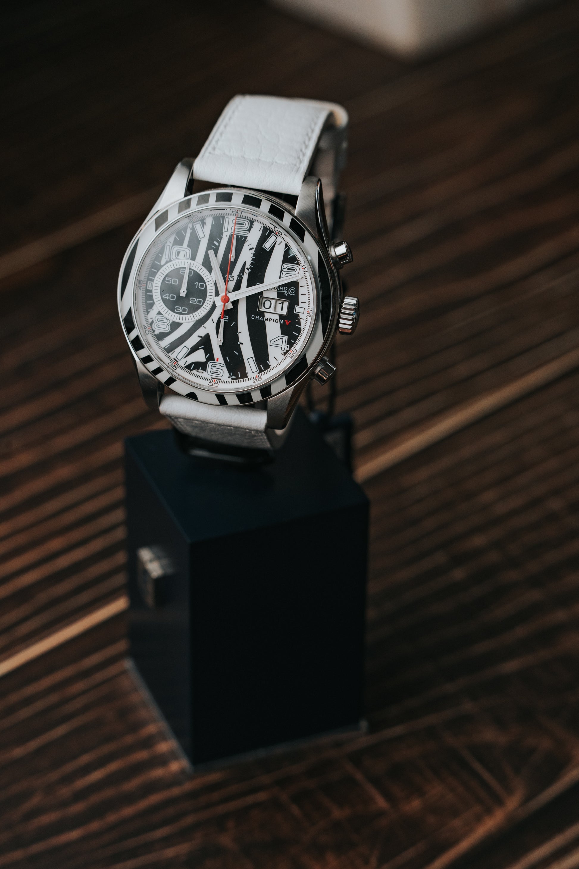 Orologio Champion V, cronografo automatico con cassa in acciaio e ghiera in ceramica. Pattern zebrato.